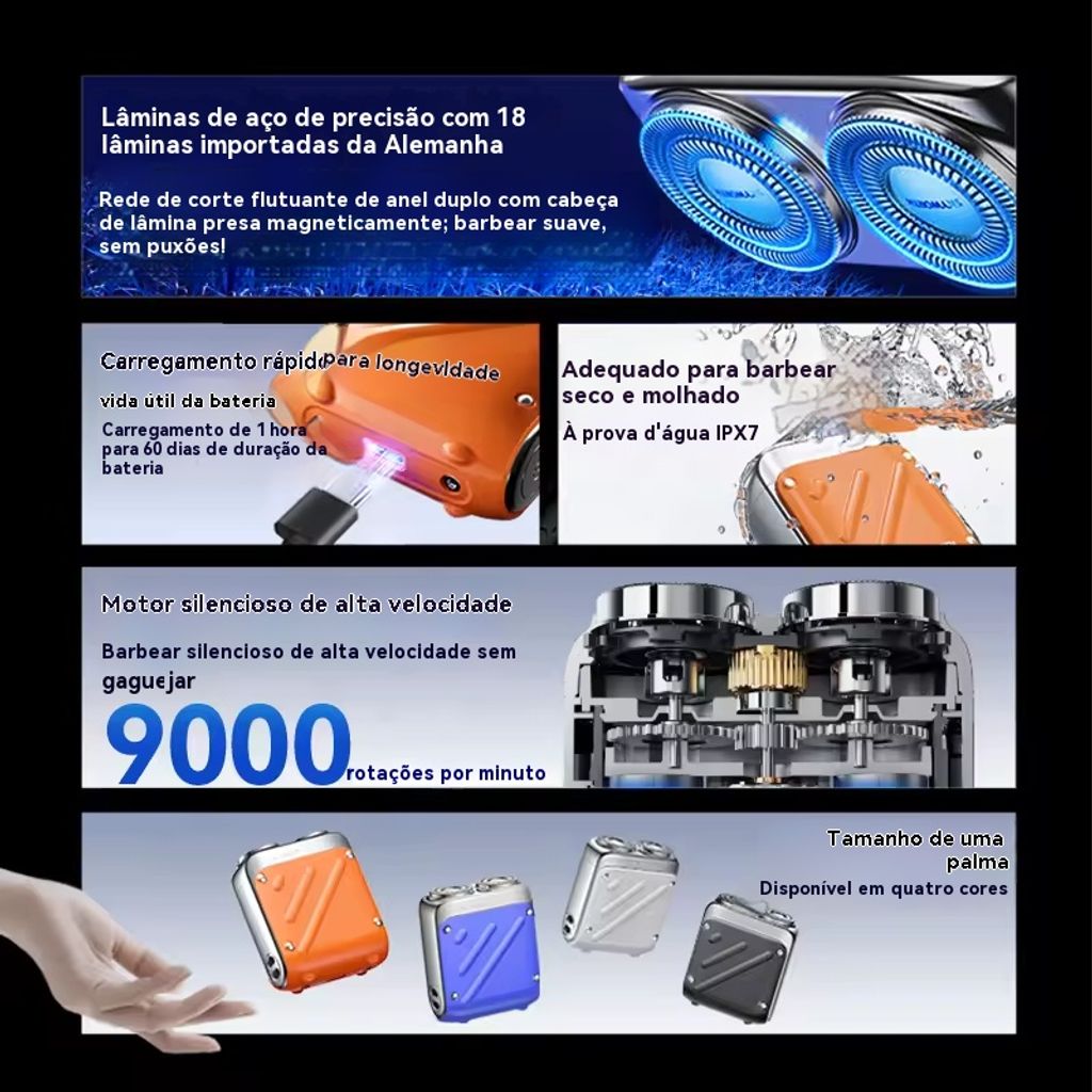 Barbeador elétrico portátil ultralimpo para homens, com lâmina dupla, ideal para o rosto e área do biquíni, e com sistema rotativo lavável.